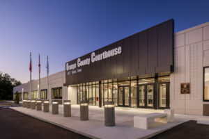 Completed in 2025 under a limited budget, Silling created a successful renovation of a 20-year-old, 33,980 square foot former office/warehouse building that included an all-new interior fit out for the Clerk of Court, traffic and civil courtroom, judges’ chambers, jury assembly, and supporting office and functions. Included in the interior design is the provisions for the segregated circulations systems of the public, courts and staff and the movement of remanded individuals. A new large clerk waiting area and payment area is provided. Other improvements included all new mechanical systems, security systems, all new exterior glazing systems, and a new roof. Supporting the interior functions are segregated parking areas for the public, staff and judges, as well as a new marquee entry sign, canopy, and a new entry plaza that reinforces the civic presentation and nature of the courts.